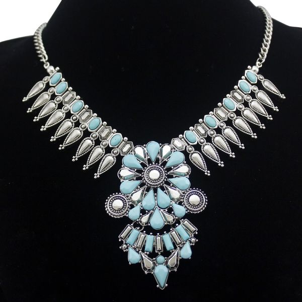 Wholesale Vintage Silver Indian Squash Blossom Stone Resin Stone Zuni Navajo Pendant Necklace Choke Collar Jewelry Chain Women Big Pendant Necklaces